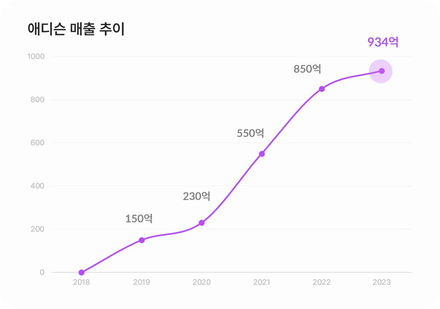 2023년 기준 매월 1,000만 명 이상의 사용자가 오퍼월에 방문하고 있으며 934억 원의 매출을 달성했습니다. 이 모든 것이 불과 5년 만에 만들어진 성과입니다. 그만큼 애디슨은 빠른 속도로 성장하고 있습니다.