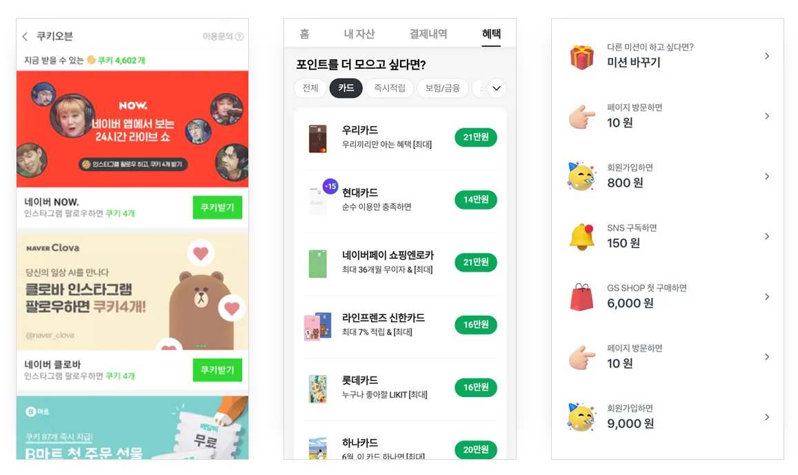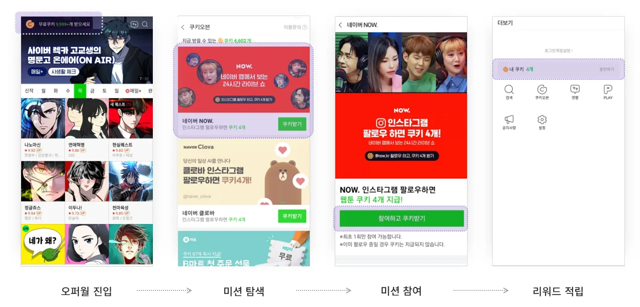 쉽게 설명하면 ‘무료 포인트 충전소’입니다. 사용자가 특정 미션을 완료했을 때 실시간으로 리워드가 제공되는 방식입니다. 대표적인 사례로, 네이버웹툰의 ‘쿠키오븐’이 있습니다. 웹툰을 좋아하시는 분이라면 ‘다음화 미리보기’를 위해 쿠키를 유료로 결제해본 경험이 있을 텐데요. ‘쿠키오븐’에서 앱 설치, SNS 구독, 상품 구매 등의 특정 미션을 수행하면 쿠키를 무료로 적립할 수 있습니다. 네이버웹툰의 ‘쿠키오븐’이 바로 애디슨에서 운영하는 오퍼월입니다. 네이버페이의 ‘혜택’, 토스의 ‘오늘의 미션’도 이와 같은 방식입니다.